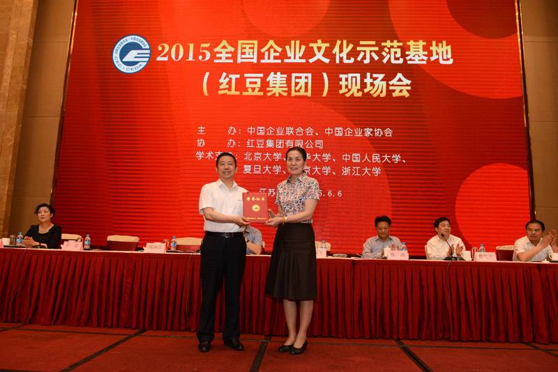 6月6日,在无锡市红豆杉庄举办的2015全国企业文化示范基地(红豆集团)现场会上,红豆集团被中国企业联合会、中国企业家协会授予“全国企业