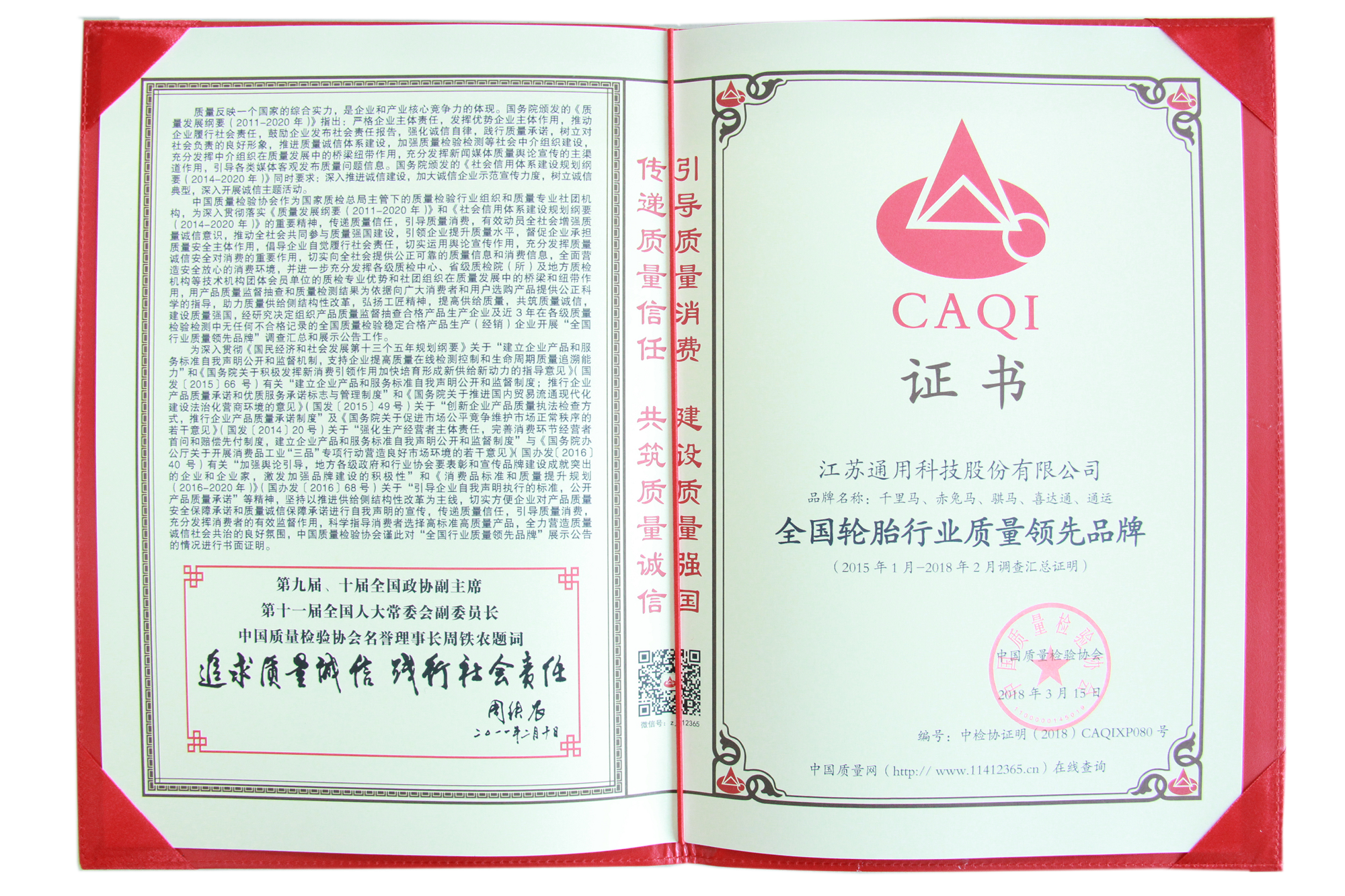 近日,在由国家质检总局和中国质量检验协会联合开展的“产品和服务质量诚信承诺”主题活动中,通用股份荣获“全国产品和服务质量诚信示范企业”、“全国轮胎行业质量领先品牌”称号。