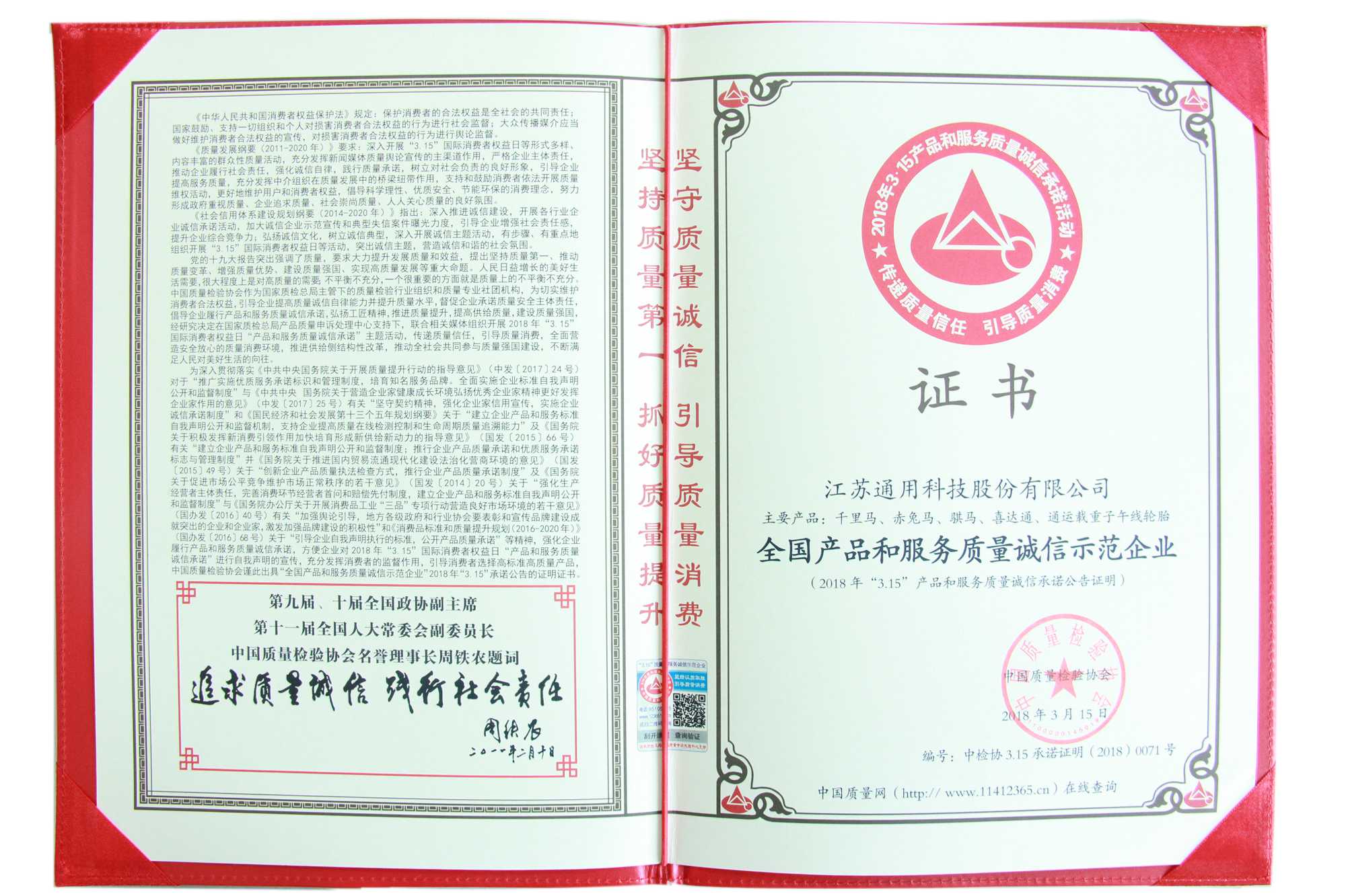 江苏通用科技股份有限公司自创建以来,高度树立“产品即人品”的经营理念,紧紧围绕“全员追求卓越、匠心打造精品”的质量方针,致力于为消费者提供更优性价比的轮胎产品。近日,通用股份凭借旗下五大品牌的卓越品质以及真诚服务,在由国家质检总局和中国质量检验协会联合开展的“产品和服务质量诚信承诺”主题活动中,荣获“全国产品和服务质量诚信示范企业”、“全国轮胎行业质量领先品牌”称号,彰显了通用股份以质立信、诚信为本的行业操守。