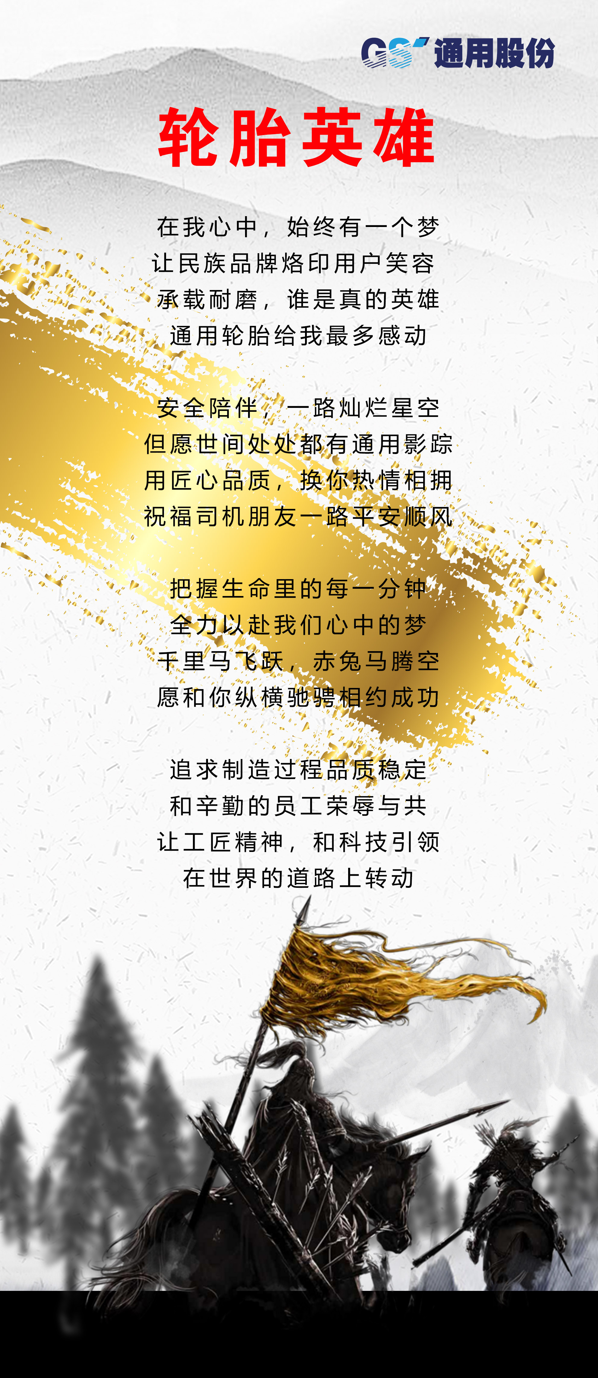 今年9月是中国第四十一个“质量月”,也是通用股份第十四届“科技质量月”。沧海横流,自强不息,方显英雄本色。今年,通用股份以一首创编的《轮胎英雄》拉开了“科技质量月”的帷幕,在这个风起云涌的竞争时代,全体通用人坚守初心,以振兴民族品牌为己任,为向广大消费者提供更加卓越的产品与服务而不断努力奋斗,推动企业迈向高质量发展。
